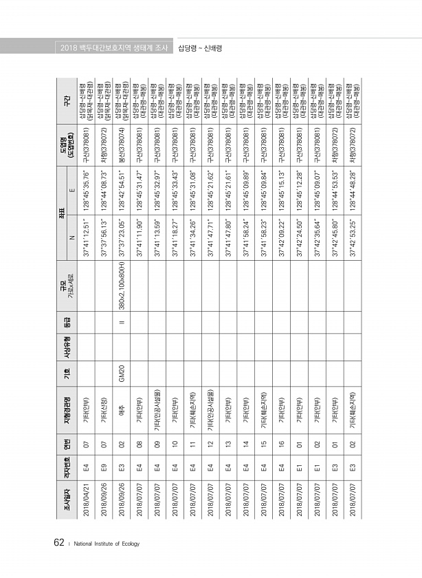 62 ? National Institute of Ecology 조사일자 격자번호 연번 지형경관명 기호 사상유형 등급 규모 가로x세로 좌표 도엽명 N E 도엽번호 구간 2018/04/21 E4 07 기타 안부 37°41′12.51″ 128°45′35.76″ 구산 378081 삽당령신배령 닭목재대관령 2018/09/26 E9 07 기타 산정 37°37′56.13″ 128°44′08.73″ 차항 378072 삽당령신배령 닭목재대관령 2018/09/26 E3 02 애추 GM20 Ⅱ 380x2,100x80 H 37°37′23.05″ 128°42′54.51″ 봉산 378074 삽당령신배령 닭목재대관령 2018/07/07 E4 08 기타 안부 37°41′11.90″ 128°45′31.47″ 구산 378081 삽당령신배령...