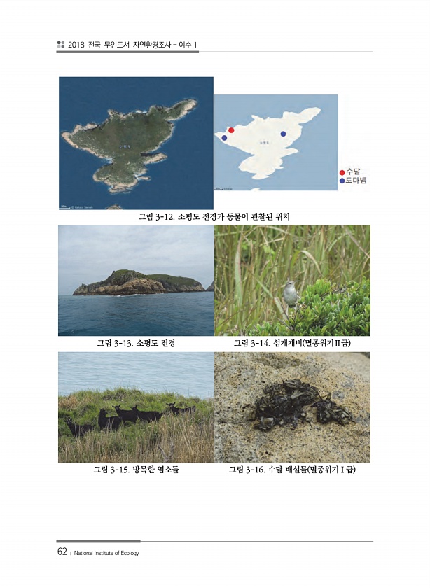 2018 전국 무인도서 자연환경조사 여수 1 62 ? National Institute of Ecology 그림 3-12. 소평도 전경과 동물이 관찰된 위치 그림 3-13. 소평도 전경 그림 3-14. 섬개개비 멸종위기Ⅱ급 그림 3-15. 방목한 염소들 그림 3-16. 수달 배설물 멸종위기Ⅰ급