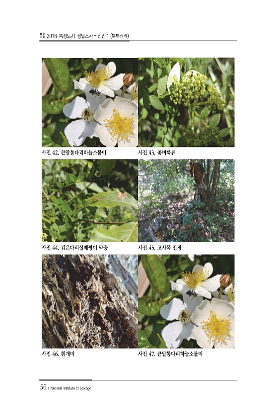 2018 특정도서 정밀조사 신안 1 북부권역 56 ? National Institute of Ecology 사진 42. 큰알통다리하늘소붙이 사진 43. 꽃벼룩류 사진 44. 검은다리실베짱이 약충 사진 45. 고사목 전경 사진 46. 흰개미 사진 47.큰알통다리하늘소붙이