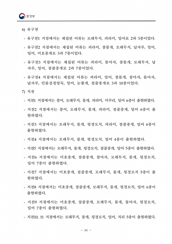 56 6 유구천 유구천1 지점에서는 채집된 어류는 모래무지, 피라미, 밀어로 2과 3종이었다. 유구천2 지점에서는 채집된 어류는 피라미, 참몰개, 모래무지, 납자루, 잉어, 밀어, 미호종개로 3과 7종이었다. 유구천3 지점에서는 채집된 어류는 피라미, 돌마자, 참몰개, 모래무지, 납 자루, 잉어, 점줄종개로 2과 7종이었다. 유구천4 지점에서는 채집된 어류는 피라미, 밀어, 참몰개, 참마자, 돌마자, 납자루, 민물검정망둑, 잉어, 눈불개, 점줄종개로 3과 10종이었다. 7 지천 지천1 지점에서는 붕어, 모래무지, 몰개, 피라미, 미꾸리, 밀어 6종이 출현하였다. 지천2 지점에서는 붕어, 모래무지, 몰개, 피라미, 점줄종개, 밀어 6종이 출 현하였다. 지천3 지점에서는 모래무지, 몰개, 됭경모치, 피라미, 점...