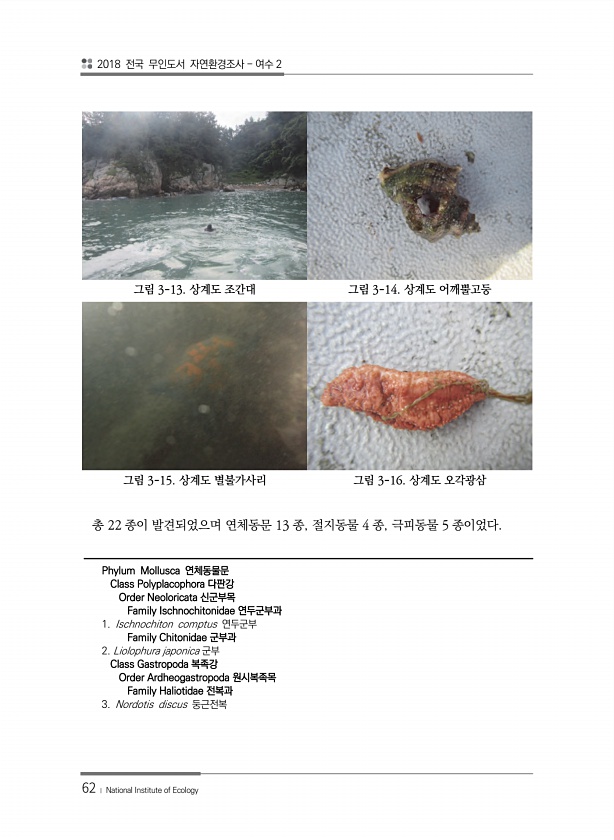 2018 전국 무인도서 자연환경조사 여수 2 62 ? National Institute of Ecology 그림 3-13. 상계도 조간대 그림 3-14. 상계도 어깨뿔고둥 그림 3-15. 상계도 별불가사리 그림 3-16. 상계도 오각광삼 총 22 종이 발견되었으며 연체동문 13 종, 절지동물 4 종, 극피동물 5 종이었다. Phylum Mollusca 연체동물문 Class Polyplacophora 다판강 Order Neoloricata 신군부목 Family Ischnochitonidae 연두군부과 1. Ischnochiton comptus 연두군부 Family Chitonidae 군부과 2. Liolophura japonica 군부 Class Gastropoda 복족강 Order Ardheogastropo...