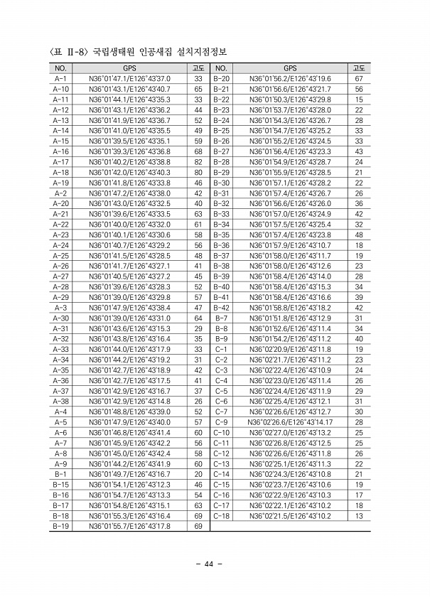 44 NO. GPS 고도 NO. GPS 고도 A-1 N36°0147.1/E126°4337.0 33 B-20 N36°0156.2/E126°4319.6 67 A-10 N36°0143.1/E126°4340.7 65 B-21 N36°0156.6/E126°4321.7 56 A-11 N36°0144.1/E126°4335.3 33 B-22 N36°0150.3/E126°4329.8 15 A-12 N36°0143.1/E126°4336.2 44 B-23 N36°0153.7/E126°4328.0 22 A-13 N36°0141.9/E126°4336.7 52 B-24 N36°0154.3/E126°4326.7 28 A-14 N36°0141.0/E126°4335.5 49 B-25 N36°0154.7/E126°4325.2 33 A-15...