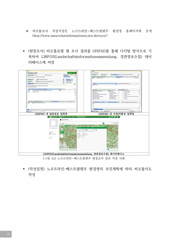 31 ※ 비오톱조사 작성지침은 노르트라인-베스트팔렌주 환경청 홈페이지에 공개 http//www.naturschutzinformationen.nrw.de/coyo/ § 현장조사 비오톱유형 별 조사 결과를 GISPAD를 통해 디지털 방식으로 기 록하여 LINFOS Landschaftsinformationssammlung, 경관정보수집 데이 터베이스에 저장 GISPAD 내 일반정보 입력창 GISPAD 내 식생/식물상 입력창 LINFOS Landschaftsinformationssammlung, 경관정보수집 데이터베이스 [그림 34] 노르트라인-베스트팔렌주 현장조사 결과 저장 사례 § 작성일정 노르트라인-베스트팔렌주 환경청의 추진계획에 따라 비오톱지도작성