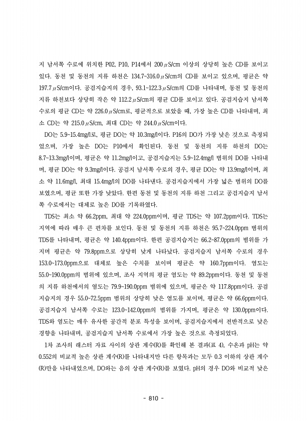 810 지 남서쪽 수로에 위치한 P02, P10, P14에서 200μS/cm 이상의 상당히 높은 CD를 보이고 있다. 동천 및 동천의 지류 하천은 134.7316.0μS/cm의 CD를 보이고 있으며, 평균은 약 197.7μS/cm이다. 공검지습지의 경우, 93.1122.3μS/cm의 CD를 나타내며, 동천 및 동천의 지류 하천보다 상당히 작은 약 112.2μS/cm의 평균 CD를 보이고 있다. 공검지습지 남서쪽 수로의 평균 CD는 약 226.0μS/cm로, 평균적으로 보았을 때, 가장 높은 CD를 나타내며, 최 소 CD는 약 215.0μS/cm, 최대 CD는 약 244.0μS/cm이다. DO는 5.915.4mg/l로, 평균 DO는 약 10.3mg/l이다. P16의 DO가 가장 낮은 것으로 측정되 었으며, 가...