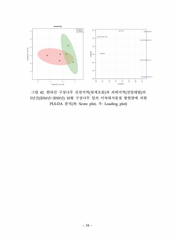 54 그림 42. 한라산 구상나무 건전지역 윗세오름 과 쇠퇴지역 진달래밭 의 3년간 2016년2018년 10월 구상나무 잎의 이차대사물질 발현량에 의한 PLS-DA 분석 좌Score plot, 우Loading plot