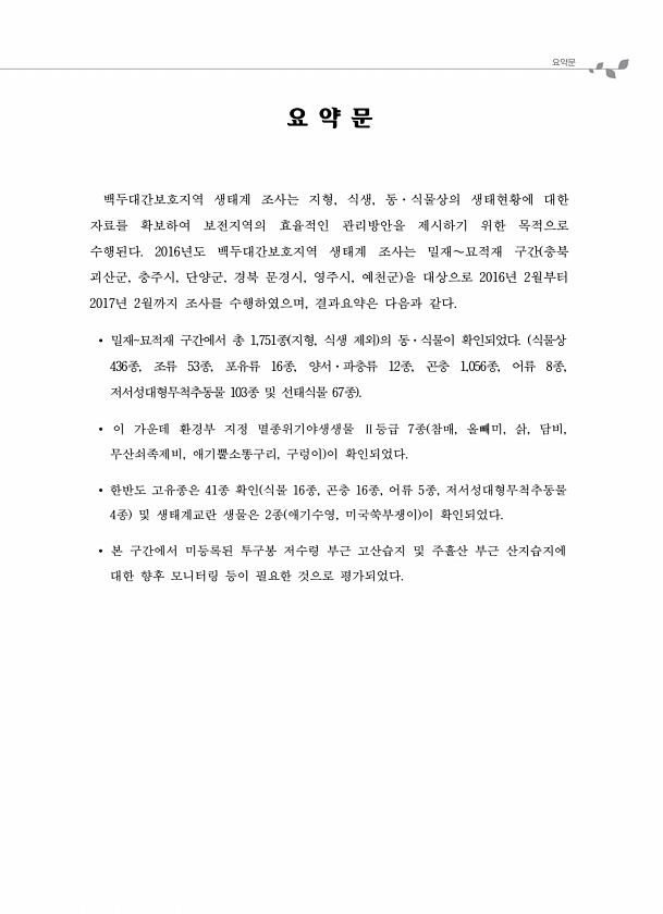 요약문 요 약 문 백두대간보호지역 생태계 조사는 지형, 식생, 동·식물상의 생태현황에 대한 자료를 확보하여 보전지역의 효율적인 관리방안을 제시하기 위한 목적으로 수행된다. 2016년도 백두대간보호지역 생태계 조사는 밀재∼묘적재 구간 충북 괴산군, 충주시, 단양군, 경북 문경시, 영주시, 예천군 을 대상으로 2016년 2월부터 2017년 2월까지 조사를 수행하였으며, 결과요약은 다음과 같다. ? 밀재묘적재 구간에서 총 1,751종 지형, 식생 제외 의 동·식물이 확인되었다. 식물상 436종, 조류 53종, 포유류 16종, 양서·파충류 12종, 곤충 1,056종, 어류 8종, 저서성대형무척추동물 103종 및 선태식물 67종 ? 이 가운데 환경부 지정 멸종위기야생생물 Ⅱ등급 7종 참매, 올빼미, 삵, 담비, 무산...