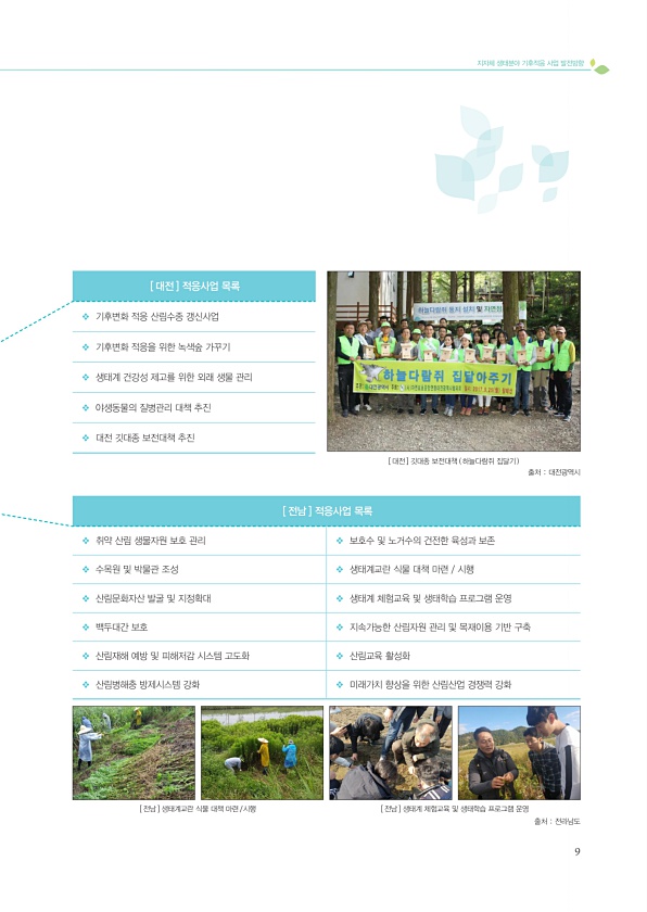[ 전남 ] 적응사업 목록 ? 취약 산림 생물자원 보호 관리 ? 보호수 및 노거수의 건전한 육성과 보존 ? 수목원 및 박물관 조성 ? 생태계교란 식물 대책 마련 시행 ? 산림문화자산 발굴 및 지정확대 ? 생태계 체험교육 및 생태학습 프로그램 운영 ? 백두대간 보호 ? 지속가능한 산림자원 관리 및 목재이용 기반 구축 ? 산림재해 예방 및 피해저감 시스템 고도화 ? 산림교육 활성화 ? 산림병해충 방제시스템 강화 ? 미래가치 향상을 위한 산림산업 경쟁력 강화 [ 전남 ] 생태계교란 식물 대책 마련 /시행 [ 대전 ] 깃대종 보전대책 하늘다람쥐 집달기 [ 대전 ] 적응사업 목록 ? 기후변화 적응 산림수종 갱신사업 ? 기후변화 적응을 위한 녹색숲 가꾸기 ? 생태계 건강성 제고를 위한 외래 생물 관리 ? 야생동물의 질...