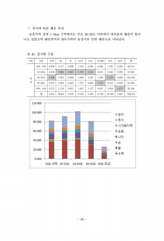 58 ○ 경사에 따른 훼손 특성 보호지역 경계 + 1km 구역에서는 주로 1030도 이하에서 대부분의 훼손이 일어 나고 있었으며 훼손면적의 50%가까이 농경지로 인한 훼손으로 나타났다. 구분 기준 수역 밭 논 나지 도로 시가화 초지 암석 계 경사 10도 이하 0.806 4.717 0.036 1.718 0.940 0.382 1.792 0.283 82.513 10-20도 0.818 7.066 0.067 2.193 1.331 0.813 4.540 0.295 91.965 20-30도 1.096 3.422 0.049 1.996 1.016 1.205 5.378 0.409 102.495 30-40도 0.937 2.493 0.063 1.797 0.856 1.373 4.618 0.643 81.442 40도 초과 0.275 ...
