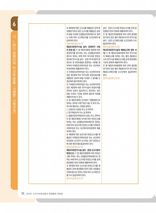 6 72 _ 환경부 유전자변형생물체 안전관리 가이드 1 L M O 법령단위 비교표 법률- 시행령- 시행규칙 ⑥ 제5항에 따른 신고서를 제출받은 관계 중 앙행정기관의 장은 신고서를 제출받은 날부 터 60일 이내에 산업통상자원부령으로 정하 는 바에 따라 신고확인서를 신고인에게 발 급하여야 한다. [전문개정 2013.12.11] 제23조의2 연구시설 설치ㆍ운영허가 사항 의 변경 등 ① 법 제22조제2항 본문에 따라 변경허가를 받으려는 자는 산업통상자원부 령으로 정하는 바에 따라 허가사항 변경신 청서에 연구시설 설치ㆍ운영 허가사항의 변 경사유 및 변경내용을 증명하는 서류를 첨 부하여 미래창조과학부장관 또는 보건복지 부장관에게 제출하여야 한다. ② 미래창조과학부장관 또는 보건복지부장 관은 제1항에 따라 허가사항 변경...