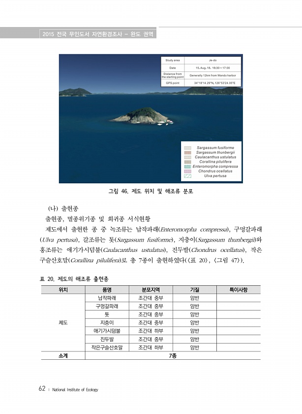 2015 전국 무인도서 자연환경조사 완도 권역 62 ? National Institute of Ecology 그림 46. 제도 위치 및 해조류 분포 나 출현종 출현종, 멸종위기종 및 희귀종 서식현황 제도에서 출현한 종 중 녹조류는 납작파래 Enteromorpha compressa , 구멍갈파래 Ulva pertusa , 갈조류는 톳 Sargassum fusiforme , 지충이 Sargassum thunbergii 와 홍조류는 애기가시덤불 Caulacanthus ustulatus , 진두발 Chondrus ocellatus , 작은 구슬산호말 Corallina pilulifera 로 총 7종이 출현하였다 표 20 , 그림 47 표 20. 제도의 해조류 출현종 위치 품명 분포지역 기질 특이사항 제도 납작파래 ...