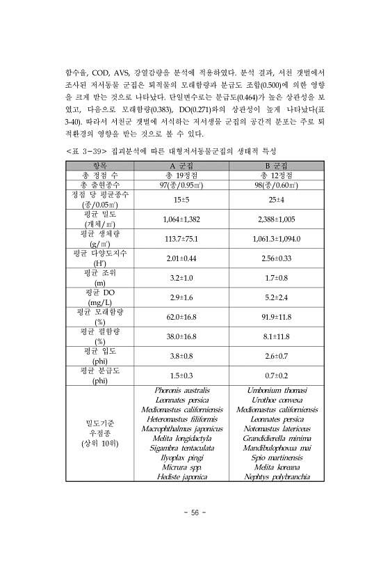 56 함수율, COD, AVS, 강열감량을 분석에 적용하였다. 분석 결과, 서천 갯벌에서 조사된 저서동물 군집은 퇴적물의 모래함량과 분급도 조합 0.500 에 의한 영향 을 크게 받는 것으로 나타났다. 단일변수로는 분급도 0.464 가 높은 상관성을 보 였고, 다음으로 모래함량 0.383 , DO 0.271 와의 상관성이 높게 나타났다 표 3-40 따라서 서천군 갯벌에 서식하는 저서생물 군집의 공간적 분포는 주로 퇴 적환경의 영향을 받는 것으로 볼 수 있다. 항목 A 군집 B 군집 총 정점 수 총 19정점 총 12정점 총 출현종수 97 종/0.95㎡ 98 종/0.60㎡ 정점 당 평균종수 종/0.05㎡ 15±5 25±4 평균 밀도 개체/㎡ 1,064±1,382 2,388±1,005 평균 생체량 g/㎡ 113....