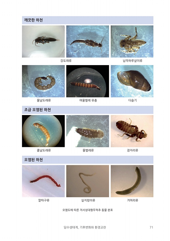 담수생태계, 기후변화와 환경교란 71 깨끗한 하천 강도래류 납작하루살이류 물날도래류 여울벌레 유충 다슬기 조금 오염된 하천 줄날도래류 물벌레류 잠자리류 오염된 하천 오염도에 따른 저서성대형무척추 동물 분포 깔따구류 실지렁이류거머리류