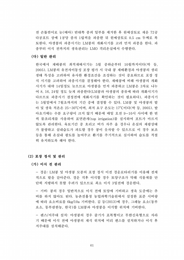 61 전 손톱깎이로 눈 배아 반대쪽 종피 일부를 제거한 후 원예상토로 채운 72공 다공포트 상에 1공당 종자 1립씩을 파종한 뒤 원예상토로 0.5 cm 두께로 복 토한다. 야생콩의 파종시기는 LM콩의 개화시기를 고려 먼저 파종을 한다. 파 종부터 이식 전까지의 생육관리는 LMO 격리온실에서 수행한다. 다 일반 관리 한국에서 재배콩의 최적재배시기는 5월 중하순부터 10월까지이다 박 등, 2005 LM콩의 유전자이동성 포장 평가 시 국내 콩 재배환경과 야생콩의 생리 생태 특성을 고려하여 유사한 환경조건을 조성하는 것이 중요하므로 포장 정 식 시기를 고려하여 파종시기를 결정해야 한다. 재배콩에 비해 야생콩의 개화 시기가 대략 14일정도 늦으므로 야생콩을 먼저 파종하고 LM콩은 3차로 나누 어 8, 16, 24일 ...