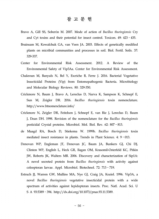 참 고 문 헌 Bravo A, Gill SS, Sober?n M. 2007. Mode of action of Bacillus thuringiensis Cry and Cyt toxins and their potential for insect control. Toxicon. 49423?435. Bruinsam M, Kowalchuk GA, van Veen JA. 2003. Effects of genetically modified plants on micribial communities and processes in soil. Biol. Fertil. Soils. 37329-337. Center for Environmental Risk Assessment. 2012. A Review of the Environme...