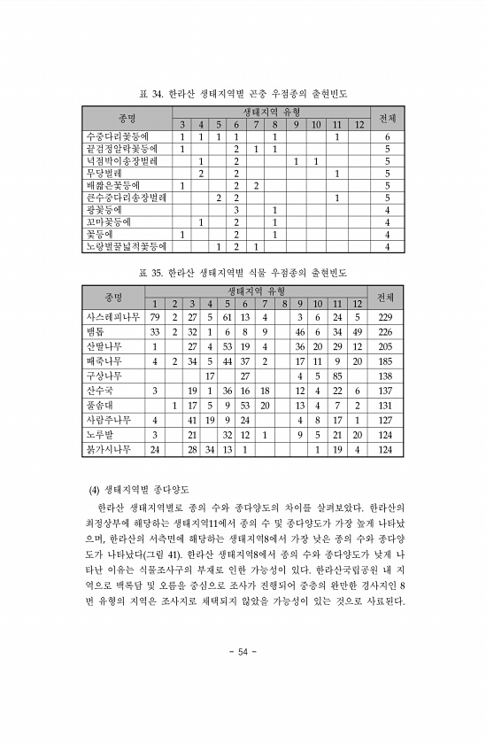 54 종명 생태지역 유형 전체 3 4 5 6 7 8 9 10 11 12 수중다리꽃등에 1 1 1 1 1 1 6 끝검정알락꽃등에 1 2 1 1 5 넉점박이송장벌레 1 2 1 1 5 무당벌레 2 2 1 5 배짧은꽃등에 1 2 2 5 큰수중다리송장벌레 2 2 1 5 광꽃등에 3 1 4 꼬마꽃등에 1 2 1 4 꽃등에 1 2 1 4 노랑벌꿀넓적꽃등에 1 2 1 4 표 34. 한라산 생태지역별 곤충 우점종의 출현빈도 종명 생태지역 유형 전체 1 2 3 4 5 6 7 8 9 10 11 12 사스레피나무 79 2 27 5 61 13 4 3 6 24 5 229 뱀톱 33 2 32 1 6 8 9 46 6 34 49 226 산딸나무 1 27 4 53 19 4 36 20 29 12 205 때죽나무 4 2 34 5 44 37 2...