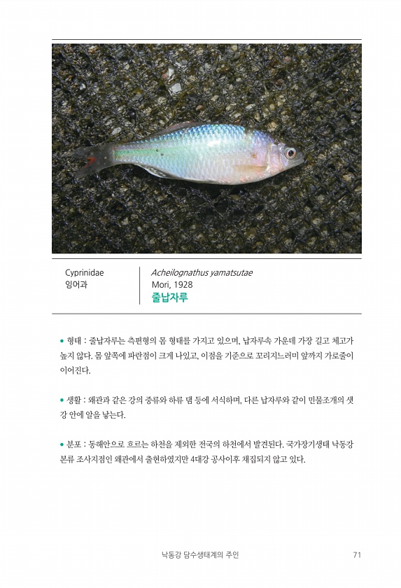 낙동강 담수생태계의 주인 71 ? 형태 줄납자루는 측편형의 몸 형태를 가지고 있으며, 납자루속 가운데 가장 길고 체고가 높지 않다. 몸 앞쪽에 파란점이 크게 나있고, 이점을 기준으로 꼬리지느러미 앞까지 가로줄이 이어진다. ? 생활 왜관과 같은 강의 중류와 하류 댐 등에 서식하며, 다른 납자루와 같이 민물조개의 샛 강 안에 알을 낳는다. ? 분포 동해안으로 흐르는 하천을 제외한 전국의 하천에서 발견된다. 국가장기생태 낙동강 본류 조사지점인 왜관에서 출현하였지만 4대강 공사이후 채집되지 않고 있다. Cyprinidae 잉어과 Acheilognathus yamatsutae Mori, 1928줄납자루