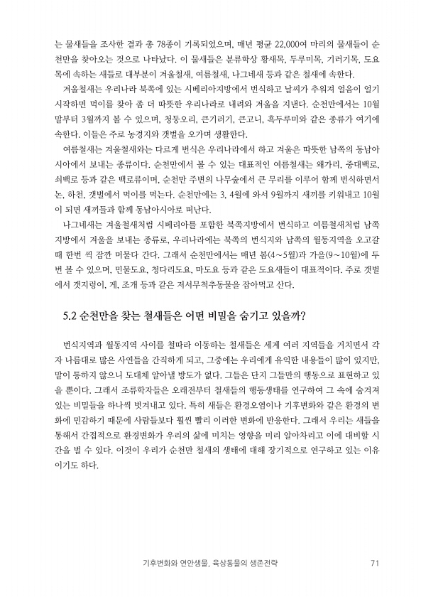 기후변화와 연안생물, 육상동물의 생존전략 71 는 물새들을 조사한 결과 총 78종이 기록되었으며, 매년 평균 22,000여 마리의 물새들이 순 천만을 찾아오는 것으로 나타났다. 이 물새들은 분류학상 황새목, 두루미목, 기러기목, 도요 목에 속하는 새들로 대부분이 겨울철새, 여름철새, 나그네새 등과 같은 철새에 속한다. 겨울철새는 우리나라 북쪽에 있는 시베리아지방에서 번식하고 날씨가 추워져 얼음이 얼기 시작하면 먹이를 찾아 좀 더 따뜻한 우리나라로 내려와 겨울을 지낸다. 순천만에서는 10월 말부터 3월까지 볼 수 있으며, 청둥오리, 큰기러기, 큰고니, 흑두루미와 같은 종류가 여기에 속한다. 이들은 주로 농경지와 갯벌을 오가며 생활한다. 여름철새는 겨울철새와는 다르게 번식은 우리나라에서 하고 겨울은 따뜻한 남쪽...