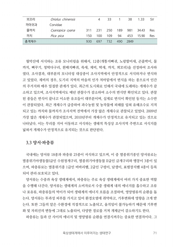 육상생태계에서 이루어지는 생태연구 71 꾀꼬리 Oriolus chinensis 4 33 1 38 1.33 SV 까마귀과 Corvidae 물까치 Cyanopica cyana 311 231 250 189 981 34.43 Res 까치 Pica pica 150 100 109 94 453 15.90 Res 총계체수 930 697 732 490 2849 월악산에 서식하는 조류 모니터링을 위해서, 12종 개똥지빠귀, 노랑할미새, 곤줄박이, 물 까치, 뻐꾸기, 청딱다구리, 흰배지빠귀, 쑥새, 제비, 딱새, 까치, 꾀꼬리 을 선정하여 조사하 였다. 조사결과, 대부분의 모니터링 대상종이 조사지역에서 안정적으로 서식하거나 번식하 고 있었다. 제비의 경우, 도기리 지역의 마을의 인가 처마밑에서 번식을 하는 종으로서 인간 의 주...