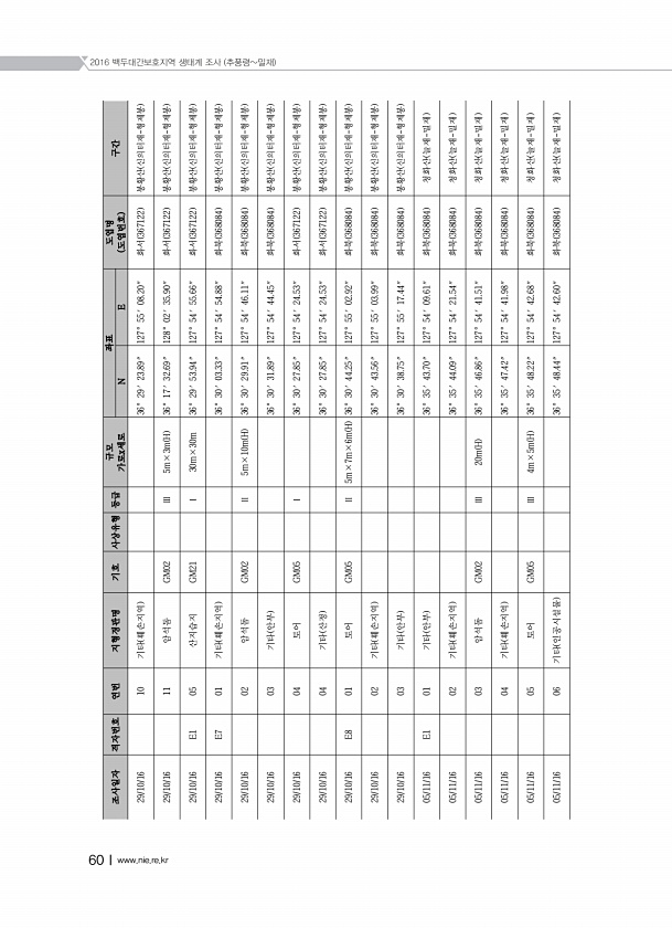 2016 백두대간보호지역 생태계 조사 추풍령밀재 60Ⅰwww.nie.re.kr 조사일자 격자번호 연번 지형경관명 기호 사상유형 등급 규모 가로x세로 좌표 도엽명 N E 도엽번호 구간 29/10/16 10 기타 훼손지역 36° 29′ 23.89″ 127° 55′ 08.20″ 화서 367122 봉황산 신의터재-형제봉 29/10/16 11 암석돔 GM02 Ⅲ 5m×3m H 36° 17′ 32.69″ 128° 02′ 35.90″ 화서 367122 봉황산 신의터재-형제봉 29/10/16 E1 05 산지습지 GM21 Ⅰ 30m×30m 36° 29′ 53.94″ 127° 54′ 55.66″ 화서 367122 봉황산 신의터재-형제봉 29/10/16 E7 01 기타 훼손지역 36° 30′ 03.33″ 127° 54′ 54....