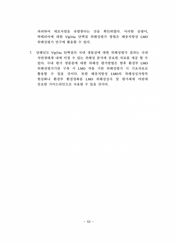 53 파괴하여 세포사멸을 유발한다는 것을 확인하였다. 이러한 곰팡이, 박테리아에 대한 Vip3Aa 단백질 위해성평가 방법은 해충저항성 LMO 위해성평가 연구에 활용할 수 있다. 7. 당해년도 Vip3Aa 단백질의 국내 생물상에 대한 위해성평가 결과는 국내 자연생태계 내에 미칠 수 있는 위해성 분석에 중요한 자료를 제공 할 수 있다. 국내 평가 생물종에 대한 위해성 평가방법은 향후 환경부 LMO 위해성평가기관 구축 시 LMO 작물 기반 위해성평가 시 기초자료로 활용할 수 있을 것이다. 또한 해충저항성 LMO의 위해성심사항목 현실화나 환경부 환경정화용 LMO 위해성심사 및 평가체계 마련에 중요한 가이드라인으로 사용될 수 있을것이다.