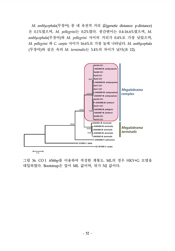 52 M. amblycephala 무창어 종 내 유전적 거리 값 genetic distancep-distance 은 0.1%였으며, M. pellegrini는 0.2%였다. 종간변이는 0.4-16.6%였으며, M. amblycephala 무창어 와 M. pellegrini 사이의 거리가 0.4%로 가장 낮았으며, M. pellegrini 와 C. carpio 사이가 16.6%로 가장 높게 나타났다. M. amblycephala 무창어 와 같은 속의 M. terminalis는 3.4%의 차이가 났다 표 12 그림 36. COⅠ 656bp를 이용하여 작성한 계통도. ML의 경우 HKY+G 모델을 대입하였다. Bootstrap은 앞이 ML 값이며, 뒤가 NJ값이다.