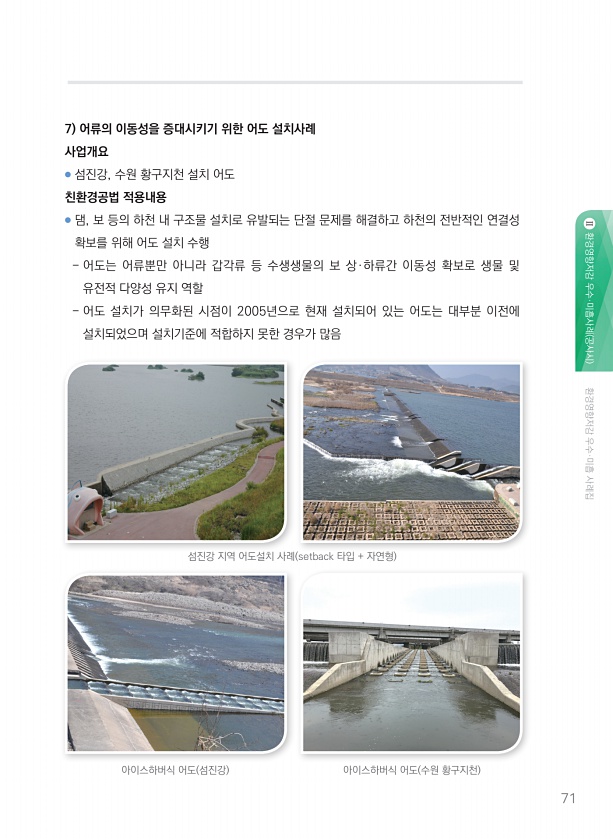 71 환경영향저감 우수·미흡사례 공사시 환경영향저감 우수·미흡 사례집 아이스하버식 어도 섬진강 아이스하버식 어도 수원 황구지천 섬진강 지역 어도설치 사례 setback 타입 + 자연형 7 어류의 이동성을 증대시키기 위한 어도 설치사례 사업개요 ● 섬진강, 수원 황구지천 설치 어도 친환경공법 적용내용 ● 댐, 보 등의 하천 내 구조물 설치로 유발되는 단절 문제를 해결하고 하천의 전반적인 연결성 확보를 위해 어도 설치 수행 어도는 어류뿐만 아니라 갑각류 등 수생생물의 보 상·하류간 이동성 확보로 생물 및 유전적 다양성 유지 역할 어도 설치가 의무화된 시점이 2005년으로 현재 설치되어 있는 어도는 대부분 이전에 설치되었으며 설치기준에 적합하지 못한 경우가많음