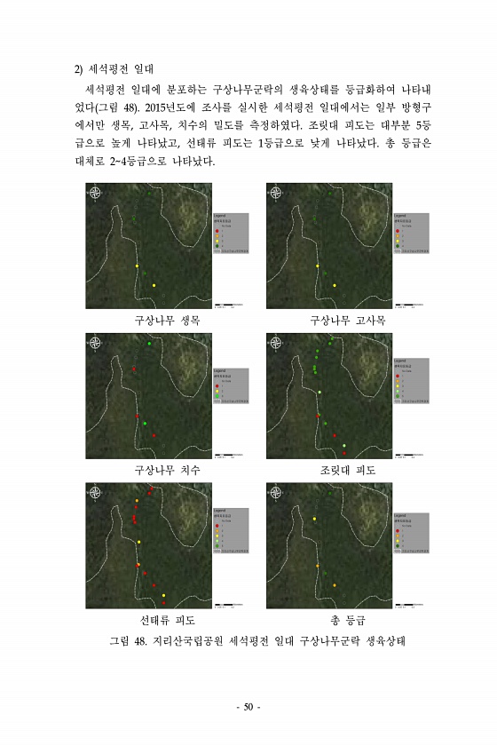50 구상나무 생목 구상나무 고사목 구상나무 치수 조릿대 피도 선태류 피도 총 등급 그림 48. 지리산국립공원 세석평전 일대 구상나무군락 생육상태 2 세석평전 일대 세석평전 일대에 분포하는 구상나무군락의 생육상태를 등급화하여 나타내 었다 그림 48 2015년도에 조사를 실시한 세석평전 일대에서는 일부 방형구 에서만 생목, 고사목, 치수의 밀도를 측정하였다. 조릿대 피도는 대부분 5등 급으로 높게 나타났고, 선태류 피도는 1등급으로 낮게 나타났다. 총 등급은 대체로 24등급으로나타났다.
