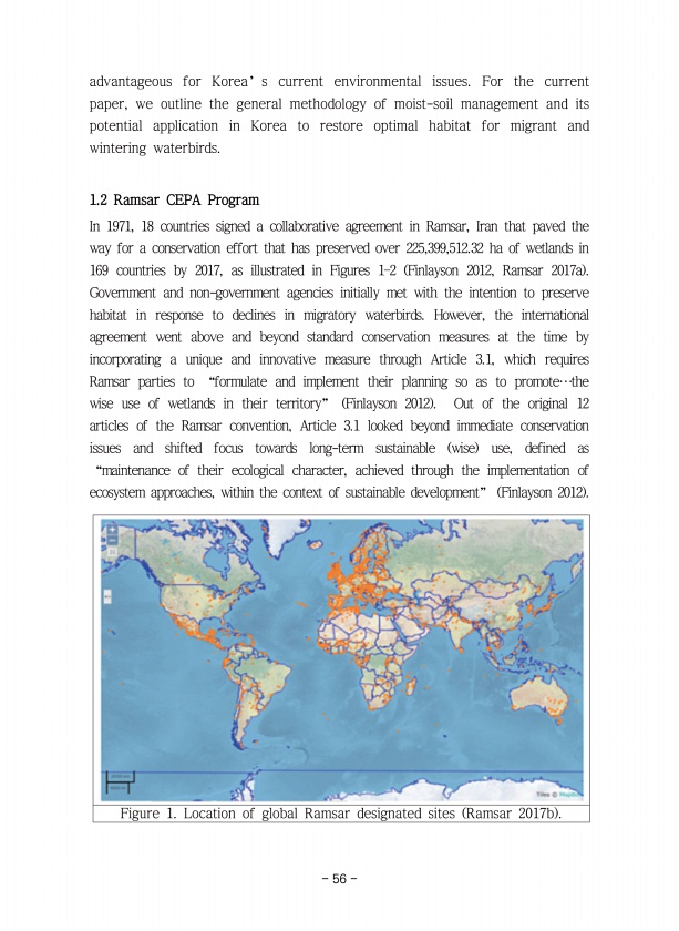 56 advantageous for Korea’s current environmental issues. For the current paper, we outline the general methodology of moist-soil management and its potential application in Korea to restore optimal habitat for migrant and wintering waterbirds. 1.2 Ramsar CEPA Program In 1971, 18 countries signed a collaborative agreement in Ramsar, Iran that paved the way for a conservation effort that has preser...