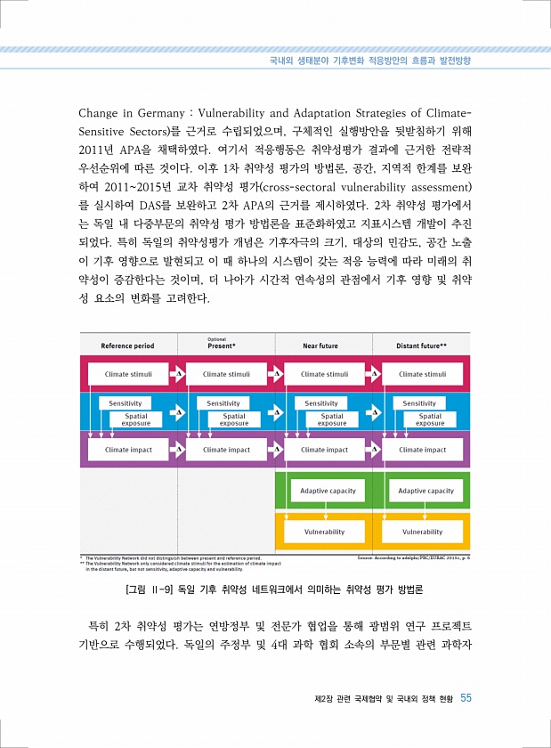 국내외 생태분야 기후변화 적응방안의 흐름과 발전방향 제2장 관련 국제협약 및 국내외 정책 현황 55 Change in Germany Vulnerability and Adaptation Strategies of ClimateSensitive Sectors 를 근거로 수립되었으며, 구체적인 실행방안을 뒷받침하기 위해 2011년 APA을 채택하였다. 여기서 적응행동은 취약성평가 결과에 근거한 전략적 우선순위에 따른 것이다. 이후 1차 취약성 평가의 방법론, 공간, 지역적 한계를 보완 하여 20112015년 교차 취약성 평가 cross-sectoral vulnerability assessment 를 실시하여 DAS를 보완하고 2차 APA의 근거를 제시하였다. 2차 취약성 평가에서 는 독일 내 다중부문의 취약성 평가...