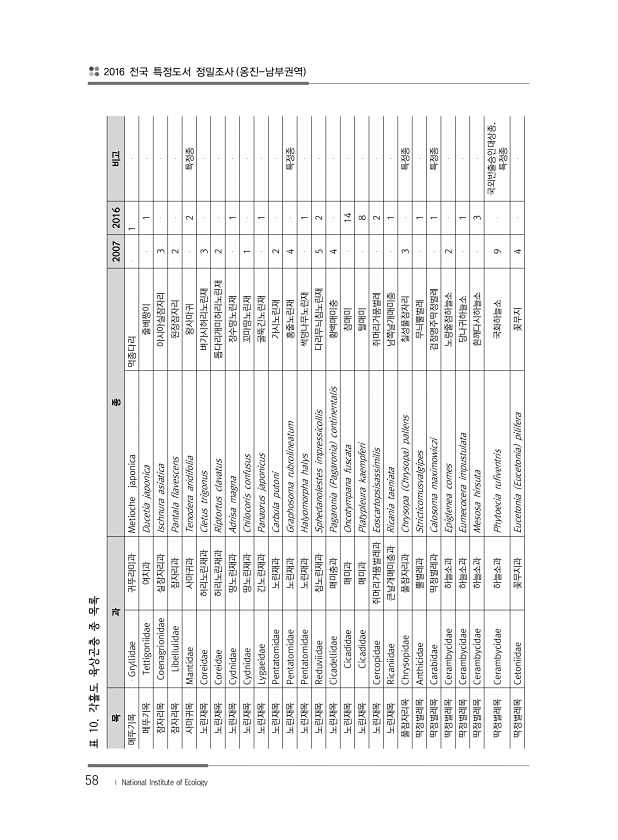 58 목 과 종 2007 2016 비고 메뚜기목 Gryllidae 귀뚜라미과 Metioche japonica 먹종다리 1 메뚜기목 Tettigoniidae 여치과 Ducetia japonica 줄베짱이 1 잠자리목 Coenagrionidae 실잠자리과 Ischnura asiatica 아시아실잠자리 3 잠자리목 Libellulidae 잠자리과 Pantala flavescens 된장잠자리 2 사마귀목 Mantidae 사마귀과 Tenodera aridifolia 왕사마귀 2 특정종 노린재목 Coreidae 허리노린재과 Cletus trigonus 벼가시허리노린재 3 노린재목 Coreidae 허리노린재과 Riptortus clavatus 톱다리개미허리노린재 2 노린재...