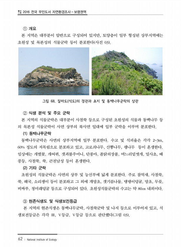 2016 전국 무인도서 자연환경조사 보령권역 62 ? National Institute of Ecology ① 개요 본 지역은 대부분이 암반으로 구성되어 있지만, 토양층이 일부 형성된 상부지역에는 초원성 및 목본성의 식물군락 등이 분포한다 사진 03 그림 68. 질마도 석도 의 경관과 초지 및 동백나무군락의 상관 ② 식생 분석 및 주요 군락 본 지역의 식물군락은 대부분이 사철쑥 등으로 구성된 초원성의 식물과 동백나무 등 의 목본성 식물군락이 사면 상부의 북사면 일대에 일부 군락을 이루며 분포한다. 1 동백나무군락 동백나무군락은 사면의 상부지역에 일부 분포한다. 수고 및 식피율은 각각 23m, 60% 정도의 저목림으로 분포하고 있고, 고로쇠나무, 산뽕나무, 팽나무 등이 혼생한다. 임상에는 개별꽃, 개여뀌, 갯...