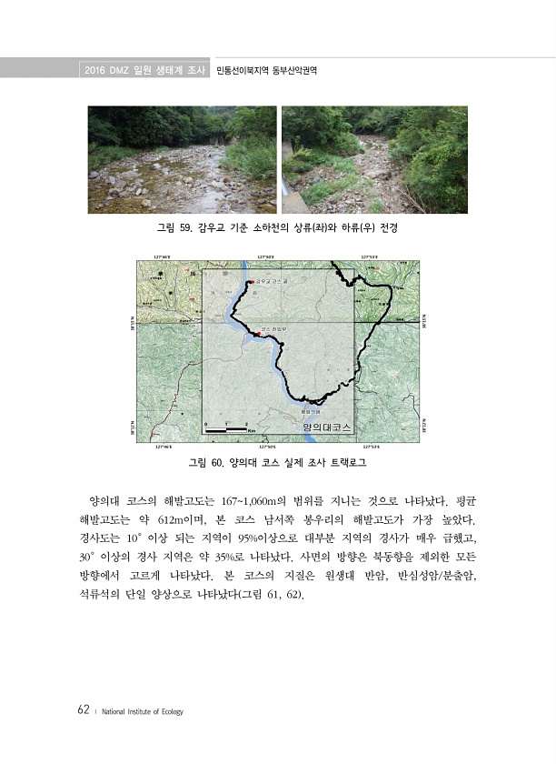 2016 DMZ 일원 생태계 조사 민통선이북지역 동부산악권역 62 ? National Institute of Ecology 그림 59. 감우교 기준 소하천의 상류 좌 와 하류 우 전경 그림 60. 양의대 코스 실제 조사 트랙로그 양의대 코스의 해발고도는 1671,060m의 범위를 지니는 것으로 나타났다. 평균 해발고도는 약 612m이며, 본 코스 남서쪽 봉우리의 해발고도가 가장 높았다. 경사도는 10°이상 되는 지역이 95%이상으로 대부분 지역의 경사가 매우 급했고, 30°이상의 경사 지역은 약 35%로 나타났다. 사면의 방향은 북동향을 제외한 모든 방향에서 고르게 나타났다. 본 코스의 지질은 원생대 반암, 반심성암/분출암, 석류석의 단일 양상으로 나타났다 그림 61, 62
