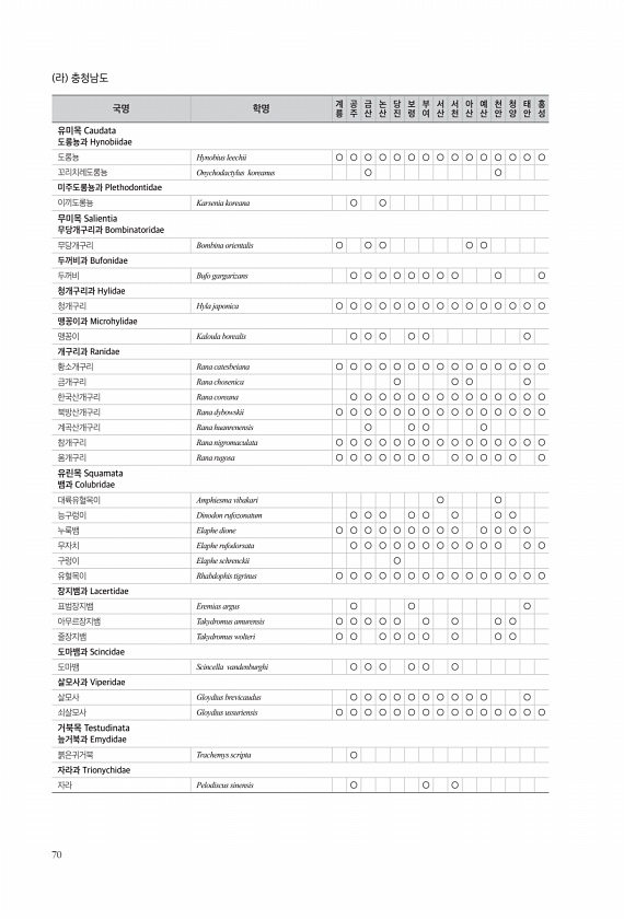 70 라 충청남도 국명 학명 계 룡 공주 금산 논산 당진 보령 부여 서산 서천 아산 예산 천안 청양 태안 홍성 유미목 Caudata 도롱뇽과 Hynobiidae 도롱뇽 Hynobius leechii ○ ○ ○ ○ ○ ○ ○ ○ ○ ○ ○ ○ ○ ○ ○ 꼬리치레도롱뇽 Onychodactylus koreanus ○ ○ 미주도롱뇽과 Plethodontidae 이끼도롱뇽 Karsenia koreana ○ ○ 무미목 Salientia 무당개구리과 Bombinatoridae 무당개구리 Bombina orientalis ○ ○ ○ ○ ○ 두꺼비과 Bufonidae 두꺼비 Bufo gargarizans ○ ○ ○ ○ ○ ○ ○ ○ ○ ○ 청개구리과 Hylidae 청개구리 Hyla japonica ○ ○ ○ ○ ○ ○ ○ ...