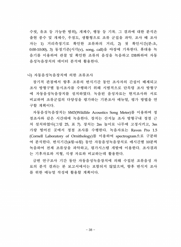 수컷, 유조 등 가능한 범위 , 개체수, 행동 등 기록. 그 결과에 대한 분석은 출현 종수 및 개체수, 우점도, 생활형으로 조류 군집을 파악. 조사 때 조사 자는 1 거리측정기로 확인한 조류와의 거리, 2 첫 확인시간 분초, 000-1000 , 3 동정기준 시각 v , song, call 을 야장에 기록한다. 휴대용 녹 음기를 이용하여 관찰 및 확인한 조류의 음성을 녹음하고 DB화하여 자동 음성녹음장치의 데이터 분석에 활용한다. 나 자동음성녹음장치에 의한 조류조사 장기적 관점에서 향후 조류의 번식기간 동안 조사자의 간섭이 배제되고 조사 방형구별 동시조사를 수행하기 위해 시범적으로 단목령 조사 방형구 에 자동음성녹음장치를 설치하였다. 녹음된 음성자료는 현지조사와 서로 비교하며 조류군집의 다양성을 평가하는 기본...