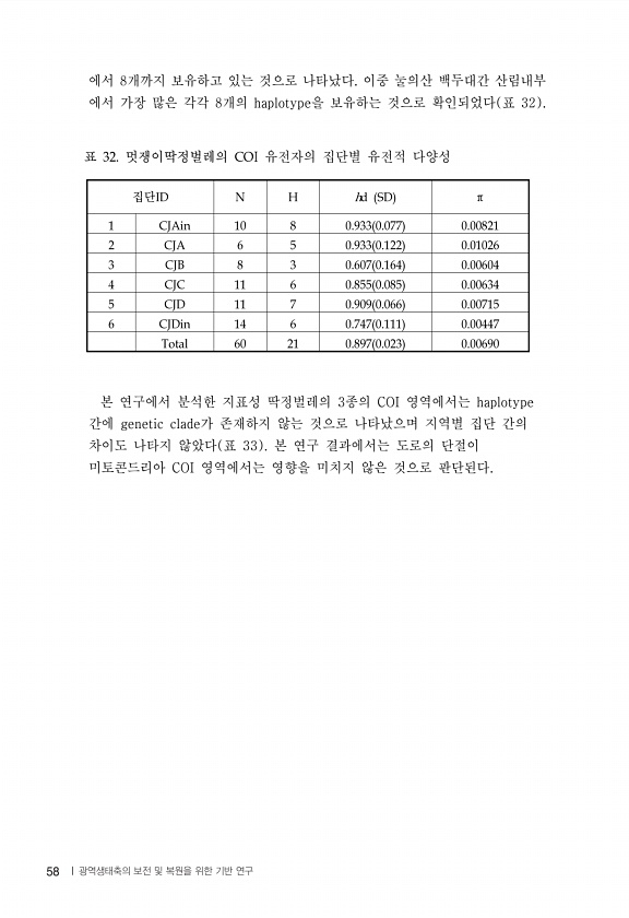 58 에서 8개까지 보유하고 있는 것으로 나타났다. 이중 눌의산 백두대간 산림내부 에서 가장 많은 각각 8개의 haplotype을 보유하는 것으로 확인되었다 표 32 표 멋쟁이딱정벌레의 I 유전자의 집단별 유전적 다양성 집단 π 본 연구에서 분석한 지표성 딱정벌레의 3종의 COI 영역에서는 haplotype 간에 genetic clade가 존재하지 않는 것으로 나타났으며 지역별 집단 간의 차이도 나타지 않았다 표 33 본 연구 결과에서는 도로의 단절이 미토콘드리아 COI 영역에서는 영향을 미치지 않은 것으로 판단된다. 58 | 광역생태축의 보전 및 복원을 위한 기반연구