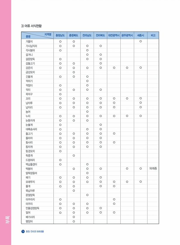 부록 74 충청?전라권 외래생물 3 어류 서식현황 가물치 가시납지리 각시붕어 갈겨니 갈문망둑 감돌고기 강준치 금강모치 긴몰개 꺽저기 꺽정이 꺽지 꾹저구 끄리 납자루 납지리 농어 누치 눈동자개 눈불개 대륙송사리 돌고기 돌마자 동사리 동자개 됭경모치 둑중개 드렁허리 떡납줄갱이 떡붕어 말뚝망둥어 메기 모래무지 몰개 묵납자루 문절망둑 미꾸라지 미꾸리 민물검정망둑 밀어 배가사리 뱀장어 ○○○ ○○○ ○ ○○○○○○ ○○○○○○○○○ ○○ ○○○ ○○○○ ○○ ○○○○ ○ ○○○ ○○ ○○○○ ○ ○ ○○○○ ○○○○○ ○ ○ ○ ○ ○ ○○○○ ○○○○○○ ○○○○○ ○○○○○ ○ ○○○ ○ ○ ○ ○○ ○ ○○○ ○ ○○○○○○ ○ ○○○ ○○ ○ ○○○ ○ ○ ○ ○○ ○○ ○ ○ ○ ○ ○ ○ ○ ○ ○○○ ○...