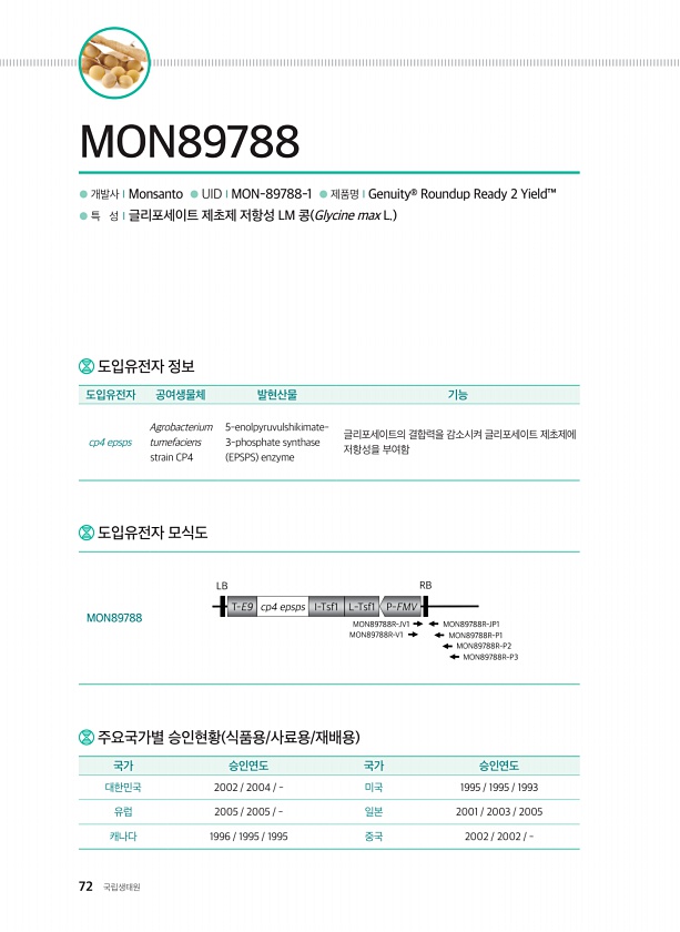 72 국립생태원 ● 개발사ⅠMonsanto ● UIDⅠMON-89788-1 ● 제품명ⅠGenuity® Roundup Ready 2 Yield™ ● 특 성Ⅰ글리포세이트 제초제 저항성 LM 콩 Glycine max L. MON89788 주요국가별 승인현황 식품용/사료용/재배용 국가 승인연도 국가 승인연도 대한민국 2002 2004 미국 1995 1995 1993 유럽 2005 2005 일본 2001 2003 2005 캐나다 1996 1995 1995 중국 2002 2002 도입유전자 정보 도입유전자 공여생물체 발현산물 기능 cp4 epsps Agrobacterium tumefaciens strain CP4 5-enolpyruvulshikimate- 3-phosphate synthase EPSPS enzyme 글...