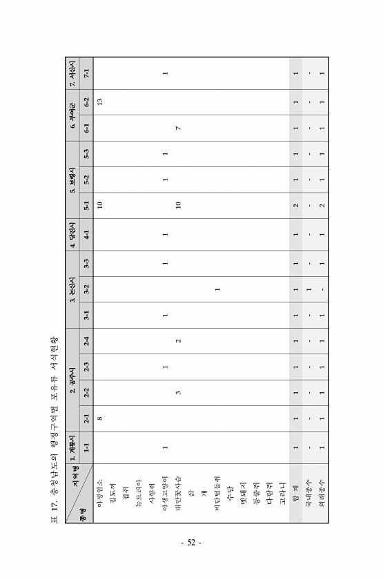 표 17. 충청남도의 행정구역별 포유류 서식현황 지역명 종명 1. 계룡시 2. 공주시 3. 논산시 4. 당진시 5. 보령시 6. 부여군 7. 서산시 1-1 2-1 2-2 2-3 2-4 3-1 3-2 3-3 4-1 5-1 5-2 5-3 6-1 6-2 7-1 야생염소 8 10 13 집토끼 집쥐 뉴트리아 사향쥐 야생고양이 1 1 1 1 1 1 1 1 대만꽃사슴 3 2 10 7 삵 개 비단털들쥐 1 수달 멧돼지 등줄쥐 다람쥐 고라니 합 계 1 1 1 1 1 1 1 1 1 2 1 1 1 1 1 국내종수 1 외래종수 1 1 1 1 1 1 1 1 2 1 1 1 11