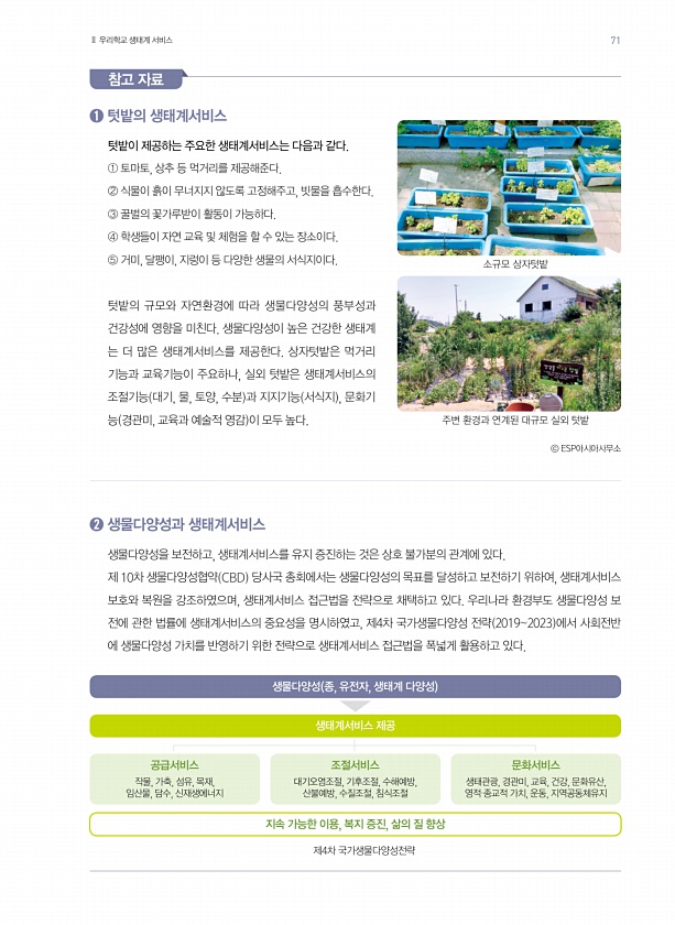 ? 텃밭의 생태계서비스 텃밭이 제공하는 주요한 생태계서비스는 다음과 같다. ① 토마토, 상추 등 먹거리를 제공해준다. ② 식물이 흙이 무너지지 않도록 고정해주고, 빗물을 흡수한다. ③ 꿀벌의 꽃가루받이 활동이 가능하다. ④ 학생들이 자연 교육 및 체험을 할 수 있는 장소이다. ⑤ 거미, 달팽이, 지렁이 등 다양한 생물의 서식지이다. 텃밭의 규모와 자연환경에 따라 생물다양성의 풍부성과 건강성에 영향을 미친다. 생물다양성이 높은 건강한 생태계 는 더 많은 생태계서비스를 제공한다. 상자텃밭은 먹거리 기능과 교육기능이 주요하나, 실외 텃밭은 생태계서비스의 조절기능 대기, 물, 토양, 수분 과 지지기능 서식지 , 문화기 능 경관미, 교육과 예술적 영감 이 모두 높다. ⓒ ESP아시아사무소 ? 생물다양성과 생태계서비스...