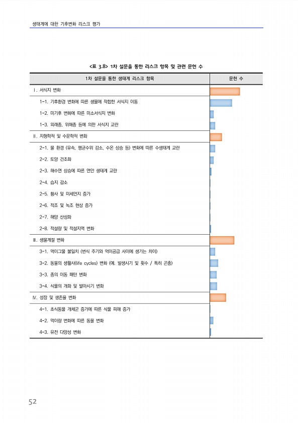 생태계에 대한 기후변화 리스크 평가 52 1차 설문을 통한 생태계 리스크 항목 문헌 수 Ⅰ. 서식지 변화 1-1. 기후환경 변화에 따른 생물에 적합한 서식지 이동 1-2. 미기후 변화에 따른 미소서식지 변화 1-3. 외래종, 위해종 등에 의한 서식지 교란 Ⅱ. 지형학적 및 수문학적 변화 2-1. 물 환경 유속, 평균수위 감소, 수온 상승 등 변화에 따른 수생태계 교란 2-2. 토양 건조화 2-3. 해수면 상승에 따른 연안 생태계 교란 2-4. 습지 감소 2-5. 황사 및 미세먼지 증가 2-6. 적조 및 녹조 현상 증가 2-7. 해양 산성화 2-8. 적설량 및 적설지역 변화 Ⅲ. 생물계절 변화 3-1. 먹이그물 불일치 번식 주기와 먹이공급 사이에 생기는 차이 3-2. 동물의 생활사 life cycles 변화 ...