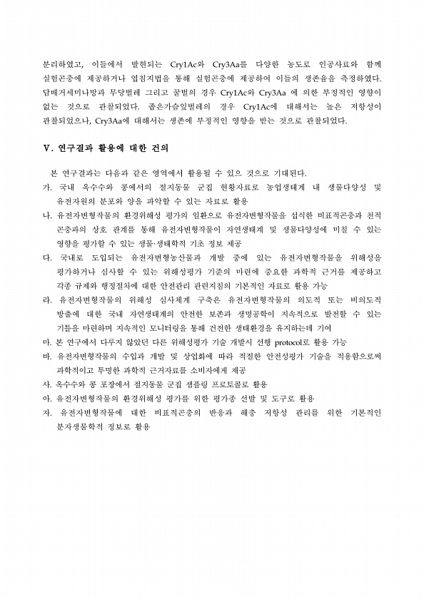 분리하였고, 이들에서 발현되는 Cry1Ac와 Cry3Aa를 다양한 농도로 인공사료와 함께 실험곤충에 제공하거나 엽침지법을 통해 실험곤충에 제공하여 이들의 생존율을 측정하였다. 담배거세미나방과 무당벌레 그리고 꿀벌의 경우 Cry1Ac와 Cry3Aa 에 의한 부정적인 영향이 없는 것으로 관찰되었다. 좁은가슴잎벌레의 경우 Cry1Ac에 대해서는 높은 저항성이 관찰되었으나, Cry3Aa에 대해서는 생존에 부정적인 영향을 받는 것으로 관찰되었다. Ⅴ. 연구결과 활용에 대한 건의 본 연구결과는 다음과 같은 영역에서 활용될 수 있으 것으로 기대된다. 가. 국내 옥수수와 콩에서의 절지동물 군집 현황자료로 농업생태계 내 생물다양성 및 유전자원의 분포와 양을 파악할 수 있는 자료로 활용 나. 유전자변형작물의 환경위해성 평가의...