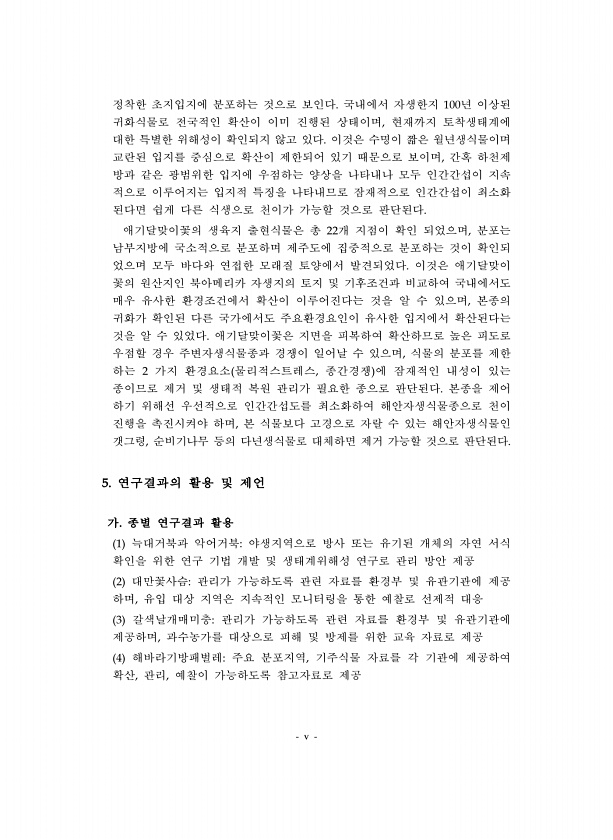 v 정착한 초지입지에 분포하는 것으로 보인다. 국내에서 자생한지 100년 이상된 귀화식물로 전국적인 확산이 이미 진행된 상태이며, 현재까지 토착생태계에 대한 특별한 위해성이 확인되지 않고 있다. 이것은 수명이 짧은 월년생식물이며 교란된 입지를 중심으로 확산이 제한되어 있기 때문으로 보이며, 간혹 하천제 방과 같은 광범위한 입지에 우점하는 양상을 나타내나 모두 인간간섭이 지속 적으로 이루어지는 입지적 특징을 나타내므로 잠재적으로 인간간섭이 최소화 된다면 쉽게 다른 식생으로 천이가 가능할 것으로 판단된다. 애기달맞이꽃의 생육지 출현식물은 총 22개 지점이 확인 되었으며, 분포는 남부지방에 국소적으로 분포하며 제주도에 집중적으로 분포하는 것이 확인되 었으며 모두 바다와 연접한 모래질 토양에서 발견되었다. 이것은 ...