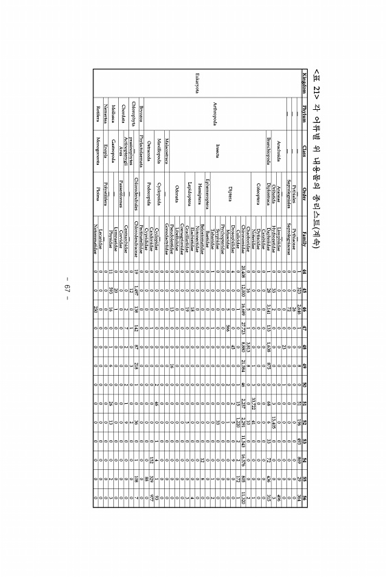 56 다. 2015년 봄철 4월+5월 조사결과 1 총 출현종수 낙동강하구와 금강하구에서 2015년 봄철의 조사결과 출현한 대형저서동물 은 총 86종 /0.8㎡ 이었다. 동물군별로는 환형동물이 37종으로 가장 다양하 여 43.0%를 차지하였고, 절지동물이 25종으로 29.1%를 점유하였다 그림 37 연체동물과 기타동물은 각각 16종, 8종이 출현하여 18.6%, 9.3%씩 점유하였 다. 그림 37. 2015년 봄철 대형저서동물 구성비율 2 평균 종수, 밀도, 생체량 2015년 봄철 대형저서동물의 정점 당 평균 종수는 17종/0.05㎡이었고, 평 균 서식밀도와 생체량은 각각 3,106개체/㎡와 489.52g/㎡였다 표 28 동물군 별 서식밀도에서는 환형동물이 70.7%로 가장 우세했고, 그 다음으로 절지동 물이...