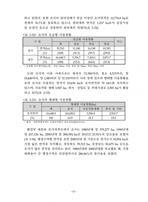 -51- 하고 있었다 또한 초지의 관리상태가 중급 이상인 초지면적은 로 전체의 를 점유하고 있으나 관리제외 면적은 로서 공공시설 및 농경지 등으로 전용하여 관리제외 하였다 표 구 분 등급별 이용현황 비고 계 상급 중급 하급 전국 면적 ha 제주 면적 ha 등급별 목초생산량 ha당 상급 이상 중급 하급 이하 표 초지의 등급별 이용현황 도내 초지의 이용 가축으로는 한육우 마리 젖소 마리 말 마리 양 마리 등 마리가 사육 중에 있으며 형태별 이용현황을 보면 초지로 이용되는 면적이 로 초지면적의 약 를 차지하고 있으며 사료작물 재배 축사 진입로 등 부대시설로 가 활용 되고 있다 표 구 분 형태별 이용현황 계 초지 사료작물재배 축사 및 기타 초지면적 출처 제주특별자치도 농축산식품국 보도자료 표 초지의 형태별 이용현황...