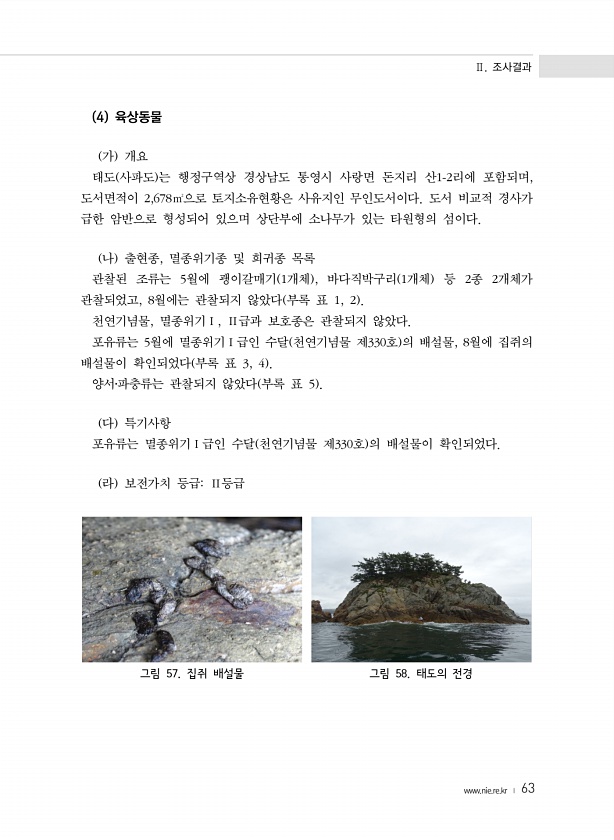 Ⅱ. 조사결과 www.nie.re.kr ? 63 4 육상동물 가 개요 태도 사파도 는 행정구역상 경상남도 통영시 사랑면 돈지리 산1-2리에 포함되며, 도서면적이 2,678㎡으로 토지소유현황은 사유지인 무인도서이다. 도서 비교적 경사가 급한 암반으로 형성되어 있으며 상단부에 소나무가 있는 타원형의 섬이다. 나 출현종, 멸종위기종 및 희귀종 목록 관찰된 조류는 5월에 괭이갈매기 1개체 , 바다직박구리 1개체 등 2종 2개체가 관찰되었고, 8월에는 관찰되지 않았다 부록 표 1, 2 천연기념물, 멸종위기Ⅰ, Ⅱ급과 보호종은 관찰되지 않았다. 포유류는 5월에 멸종위기Ⅰ급인 수달 천연기념물 제330호 의 배설물, 8월에 집쥐의 배설물이 확인되었다 부록 표 3, 4 양서?파충류는 관찰되지 않았다 부록 표 5 다 특기사항...