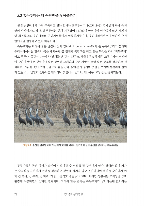 72 국가장기생태연구 5.3 흑두루미는 왜 순천만을 찾아올까? 현재 순천만에서 가장 주목받고 있는 철새는 흑두루미이다 그림 5-1 갈대밭과 함께 순천 만의 상징이기도 하다. 흑두루미는 현재 지구상에 11,000여 마리밖에 남아있지 않은 세계적 인 희귀종으로 우리나라의 천연기념물이자 멸종위기종이며, 우리나라에서는 유일하게 순천 만에서만 월동하고 있기 때문이다. 흑두루미는 머리에 붉은 반점이 있어 영어로 ‘Hooded crane 모자 쓴 두루미 ’라고 불리며 우리나라에서는 흰색의 목을 제외하면 몸 전체가 흑갈색을 띠고 있는 특징을 따서 ‘흑두루미’ 라고 부른다. 몸길이 1 m에 양 날개를 편 길이 1.87 m, 체중 3.7 ㎏의 대형 조류이지만 경계심 이 강하여 밤에는 갯벌이나 넓은 강변의 모래밭과 같은 사방이...
