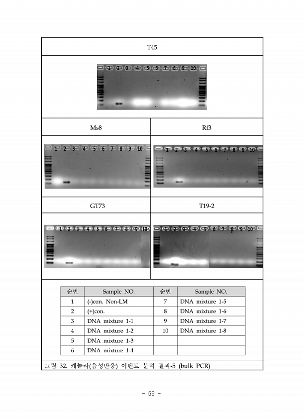 T45 Ms8 Rf3 GT73 T19-2 순번 Sample NO. 순번 Sample NO. 1 con. Non-LM 7 DNA mixture 1-5 2 + con. 8 DNA mixture 1-6 3 DNA mixture 1-1 9 DNA mixture 1-7 4 DNA mixture 1-2 10 DNA mixture 1-8 5 DNA mixture 1-3 6 DNA mixture 1-4 그림 32. 캐놀라 음성반응 이벤트 분석 결과-5 bulk PCR