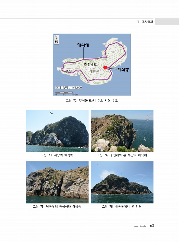 Ⅱ. 조사결과 www.nie.re.kr ? 63 그림 72. 알섬 난도 의 주요 지형 분포 그림 73. 서단의 해식애 그림 74. 능선에서 본 북안의 해식애 그림 75. 남동부의 해식애와 해식동 그림 76. 북동쪽에서 본전경