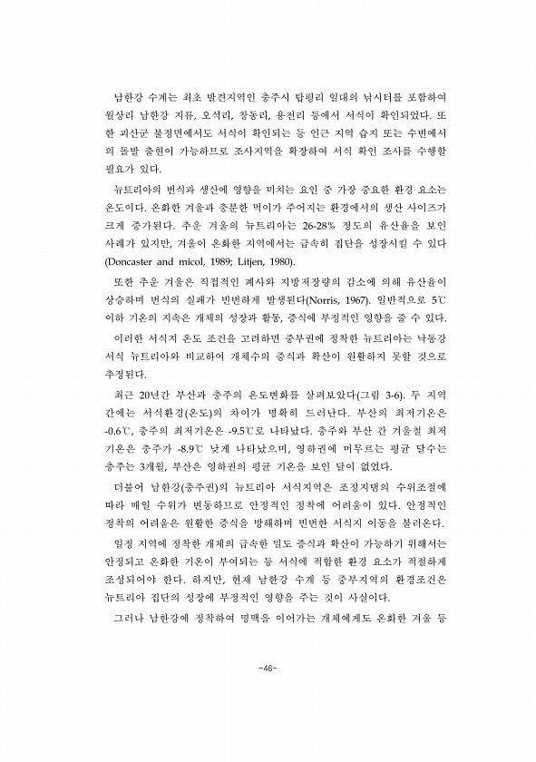 -46- 남한강 수계는 최초 발견지역인 충주시 탑평리 일대의 낚시터를 포함하여 월상리 남한강 지류, 오석리, 창동리, 용전리 등에서 서식이 확인되었다. 또 한 괴산군 불정면에서도 서식이 확인되는 등 인근 지역 습지 또는 수변에서 의 돌발 출현이 가능하므로 조사지역을 확장하여 서식 확인 조사를 수행할 필요가 있다. 뉴트리아의 번식과 생산에 영향을 미치는 요인 중 가장 중요한 환경 요소는 온도이다. 온화한 겨울과 충분한 먹이가 주어지는 환경에서의 생산 사이즈가 크게 증가된다. 추운 겨울의 뉴트리아는 26-28% 정도의 유산율을 보인 사례가 있지만, 겨울이 온화한 지역에서는 급속히 집단을 성장시킬 수 있다 Doncaster and micol, 1989; Litjen, 1980 또한 추운 겨울은 직접적인 폐사와 지...
