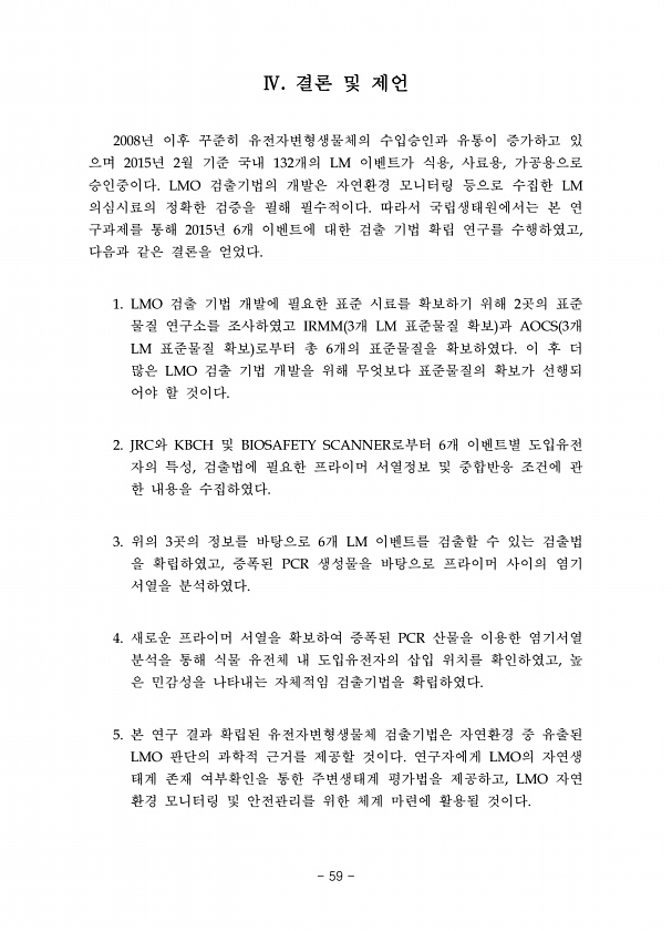 Ⅳ. 결론 및 제언 2008년 이후 꾸준히 유전자변형생물체의 수입승인과 유통이 증가하고 있 으며 2015년 2월 기준 국내 132개의 LM 이벤트가 식용, 사료용, 가공용으로 승인중이다. LMO 검출기법의 개발은 자연환경 모니터링 등으로 수집한 LM 의심시료의 정확한 검증을 필해 필수적이다. 따라서 국립생태원에서는 본 연 구과제를 통해 2015년 6개 이벤트에 대한 검출 기법 확립 연구를 수행하였고, 다음과 같은 결론을 얻었다. 1. LMO 검출 기법 개발에 필요한 표준 시료를 확보하기 위해 2곳의 표준 물질 연구소를 조사하였고 IRMM 3개 LM 표준물질 확보 과 AOCS 3개 LM 표준물질 확보 로부터 총 6개의 표준물질을 확보하였다. 이 후 더 많은 LMO 검출 기법 개발을 위해 무엇보다 표준물질의 확...